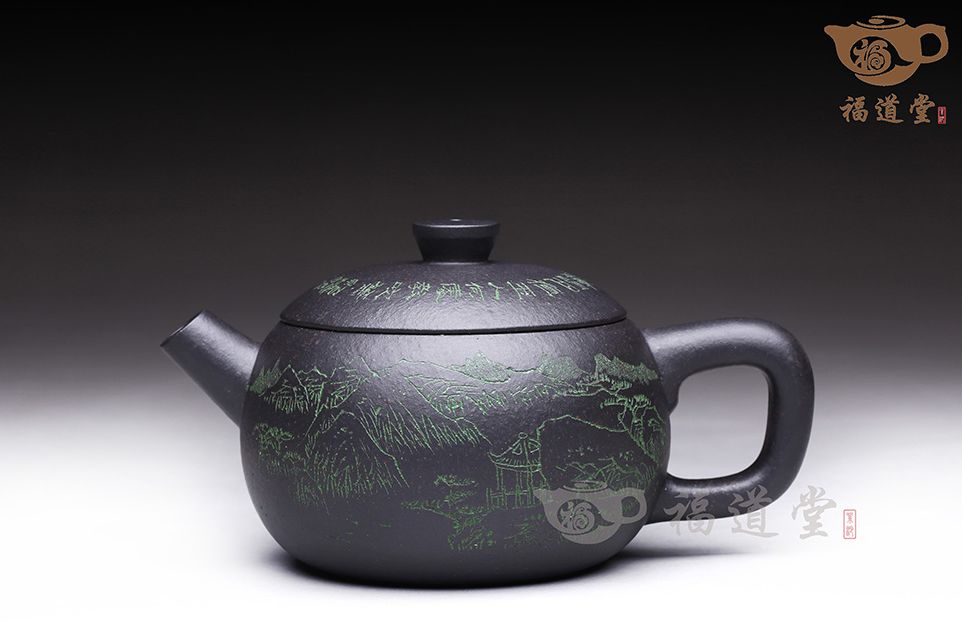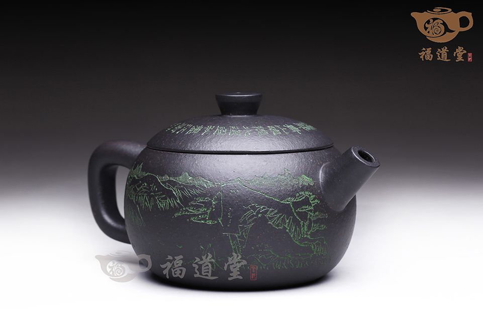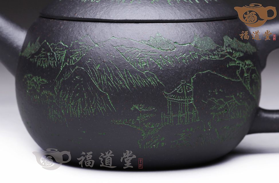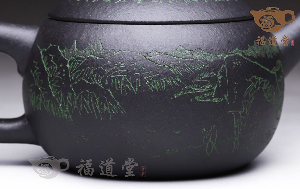題畫與壺蓋之詩詞相呼應;又以綠為色,與壺身之墨黑、紅砂相映襯;設計之精妙、構思之精巧可見一斑。