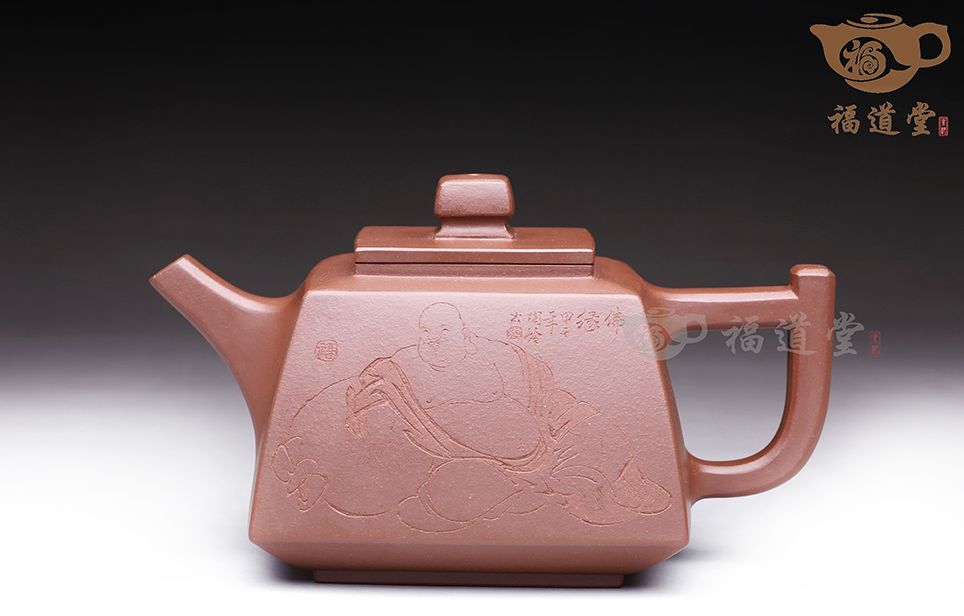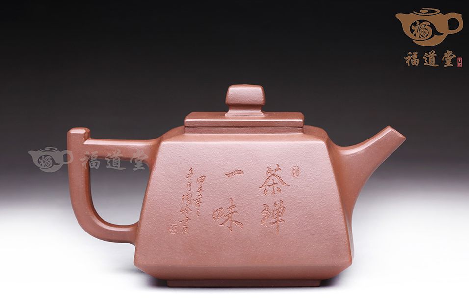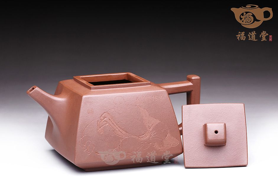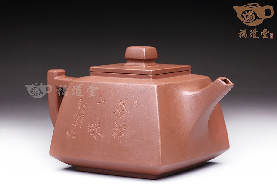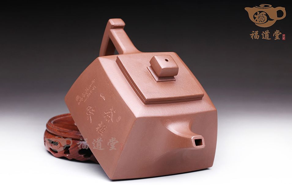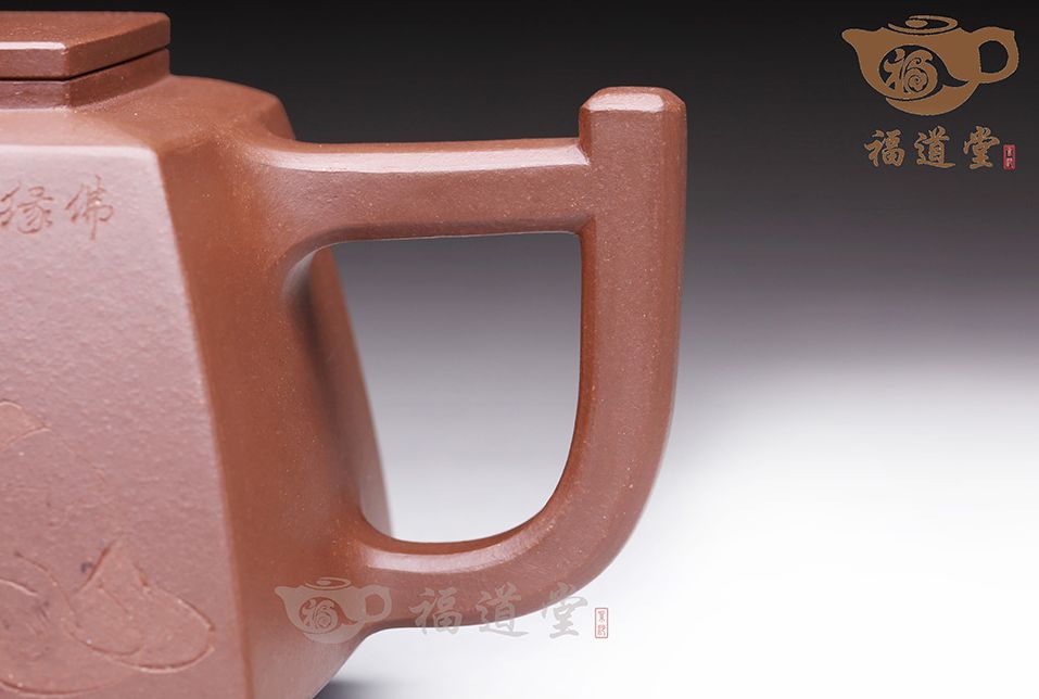方形壺把于端方中帶有弧度,設計莊重大方而又帶有禪味,與壺身銘繪呼應。