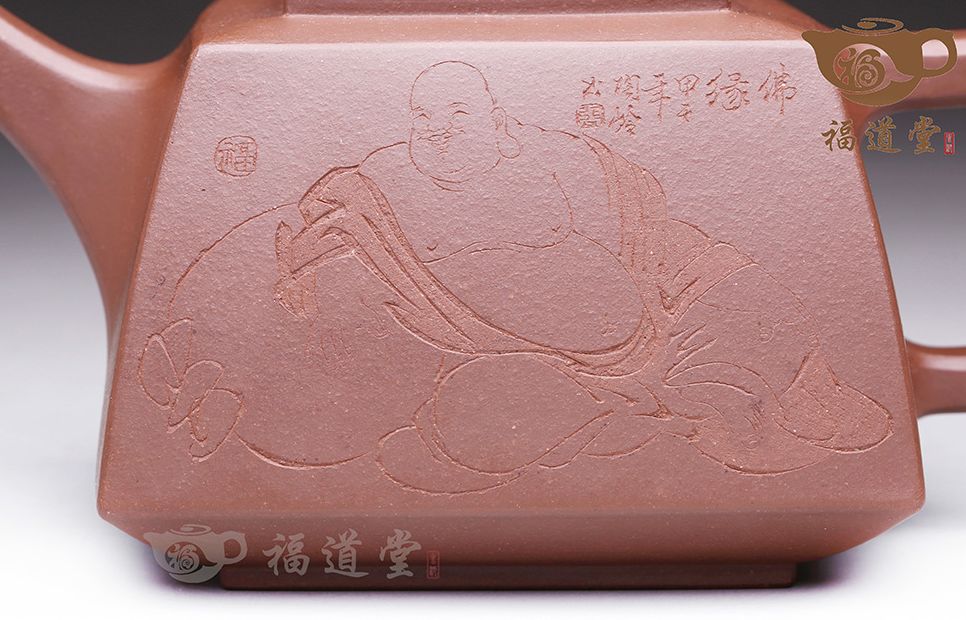 壺身正面由宜興陶刻家張陶嶺刻繪裝飾,一尊彌勒佛像飄逸流暢,神態安祥,神情躍然。
